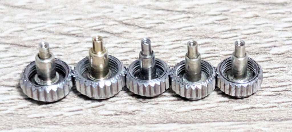 今回の修理のご依頼は530-0、531-0、600-0のリューズ5点で、全てねじ込みが半回転から1回転未満であったことから内ネジを修理しました。修理後は約2回転ねじ込めるようになり、写真左側2個の600-0はパイプ部分がスリップとバネが戻らない症状を抱えていたため併せて修理、調整を致しました。内側のゴムパッキン、シリコンパッキンは交換済みです。